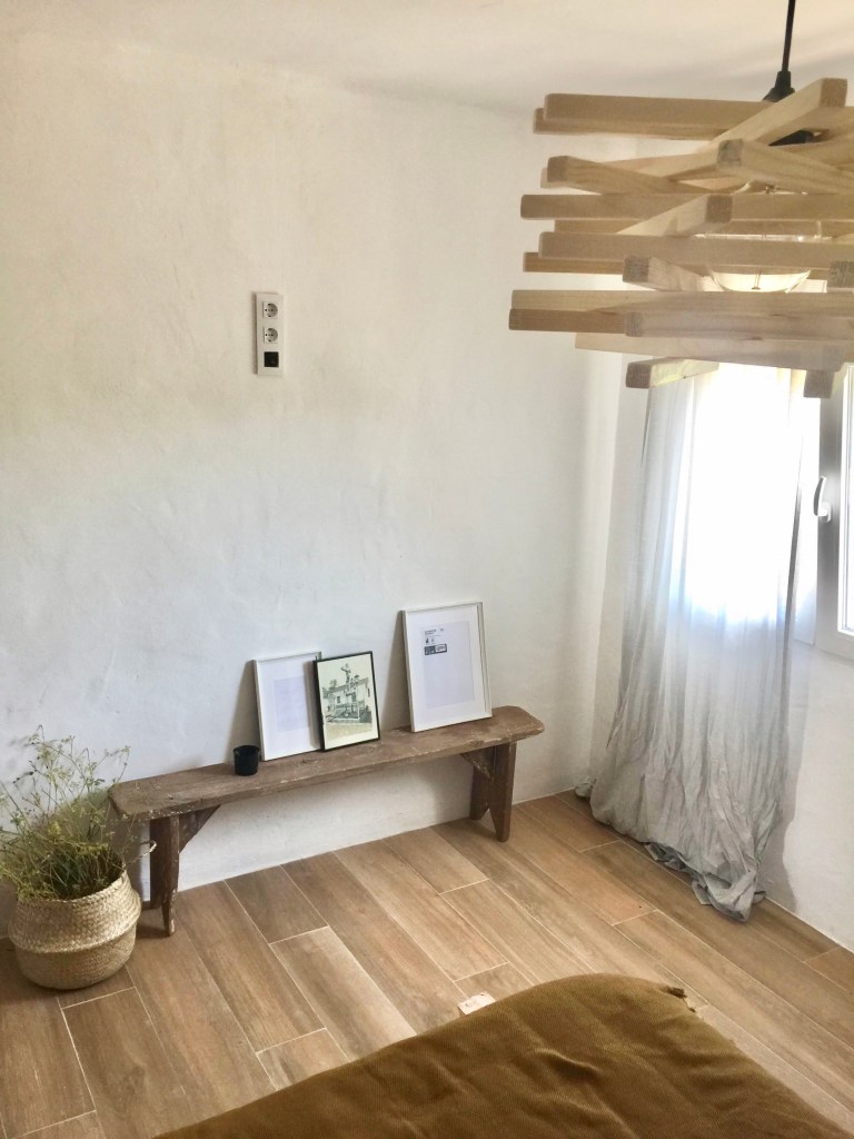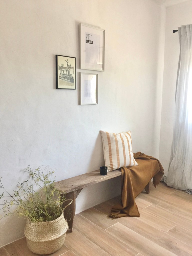 La zona de los pies de la cama, gracias a la ampliación que hicimos a partir de las columnas, se ha quedado súper amplia y nos da un espacio con mucho juego. La idea es crear un rincón de lectura con un sillón orejero al lado de la ventana y una estantería para guardar los libros. Pero de momento, hemos restaurado este banco para crear un bonito rincón debajo de lo que será el espacio de la TV.