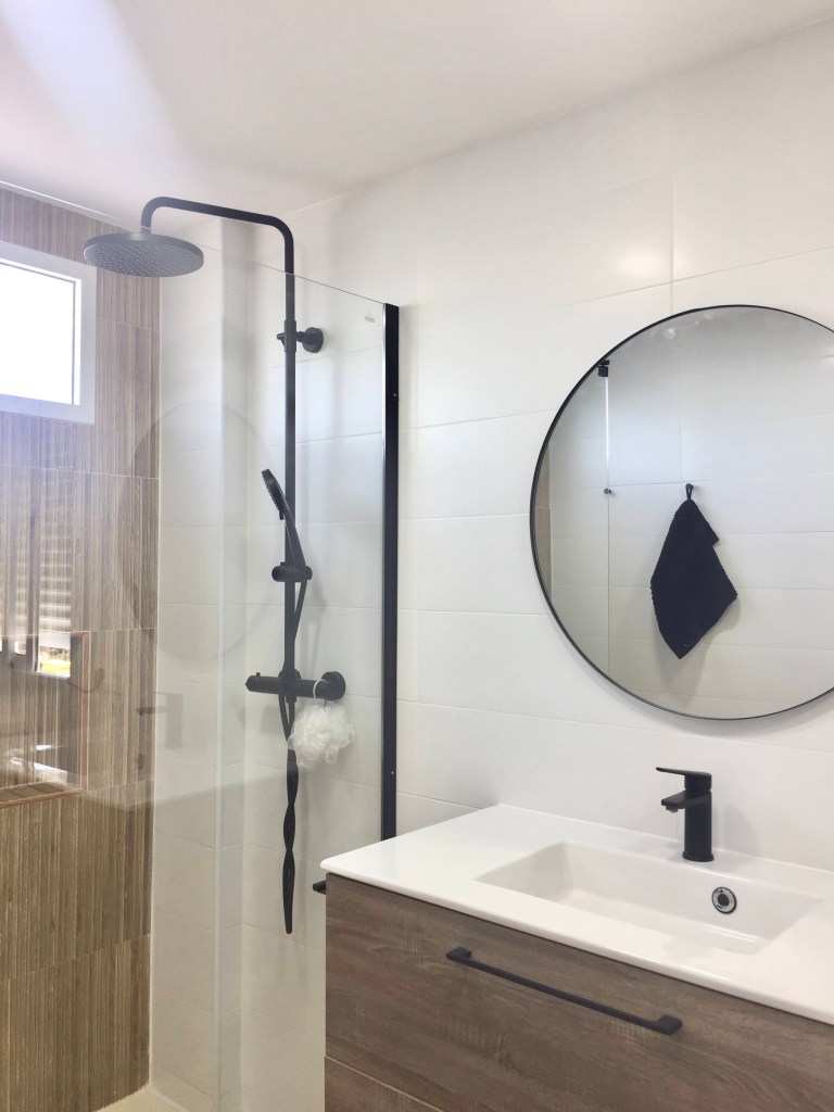 La mampara la compramos en BricoMart súper bien de precio. El marco era cromado, pero teníamos claro que queríamos los detalles en negro, por lo que acabamos pintándolo con spray. Y así hicimos con los tiradores de los cajones que también eran cromados.